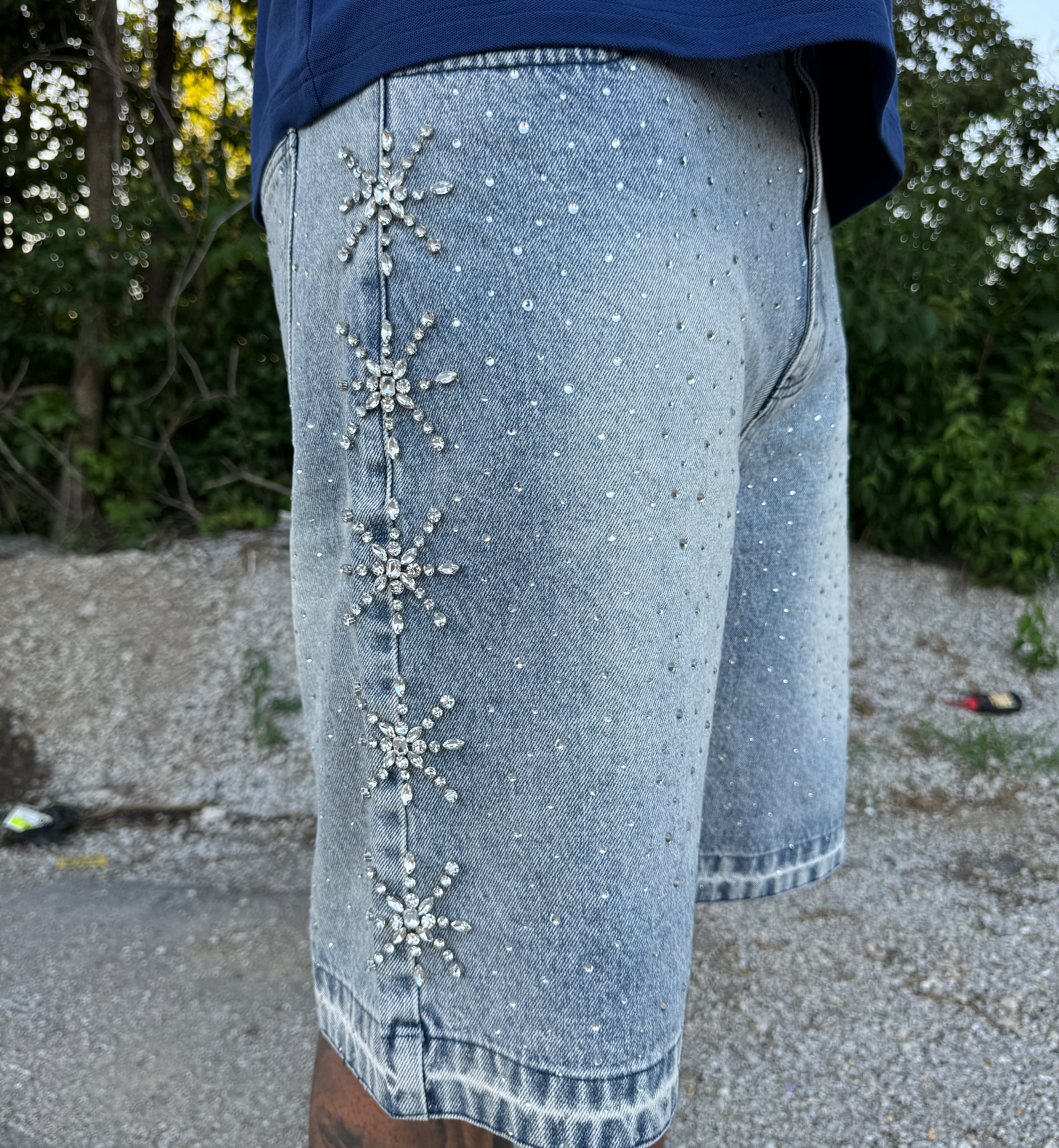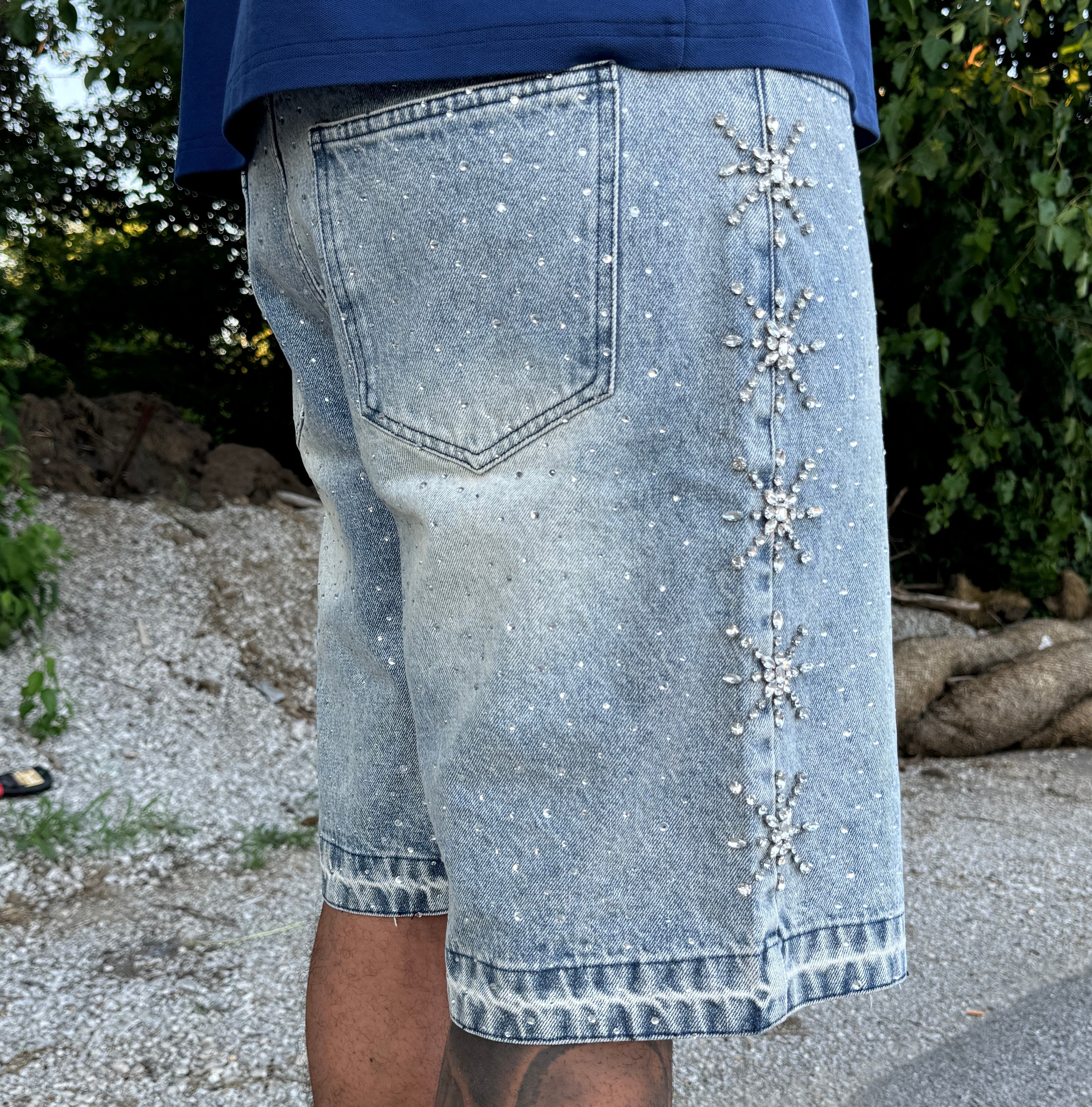 Statement denim jorts with full-front-and-back VVS rhinestone embossing. Made from 100 % Italian cotton and precision-crafted in Germany. Stand out with every step